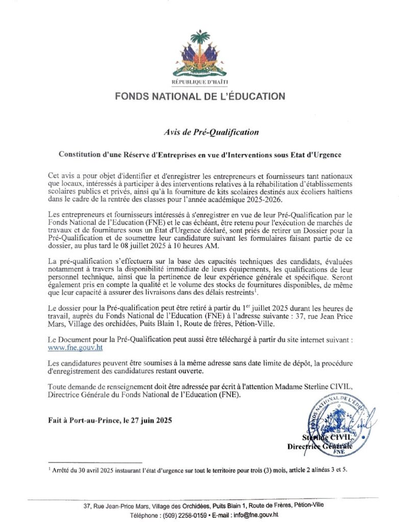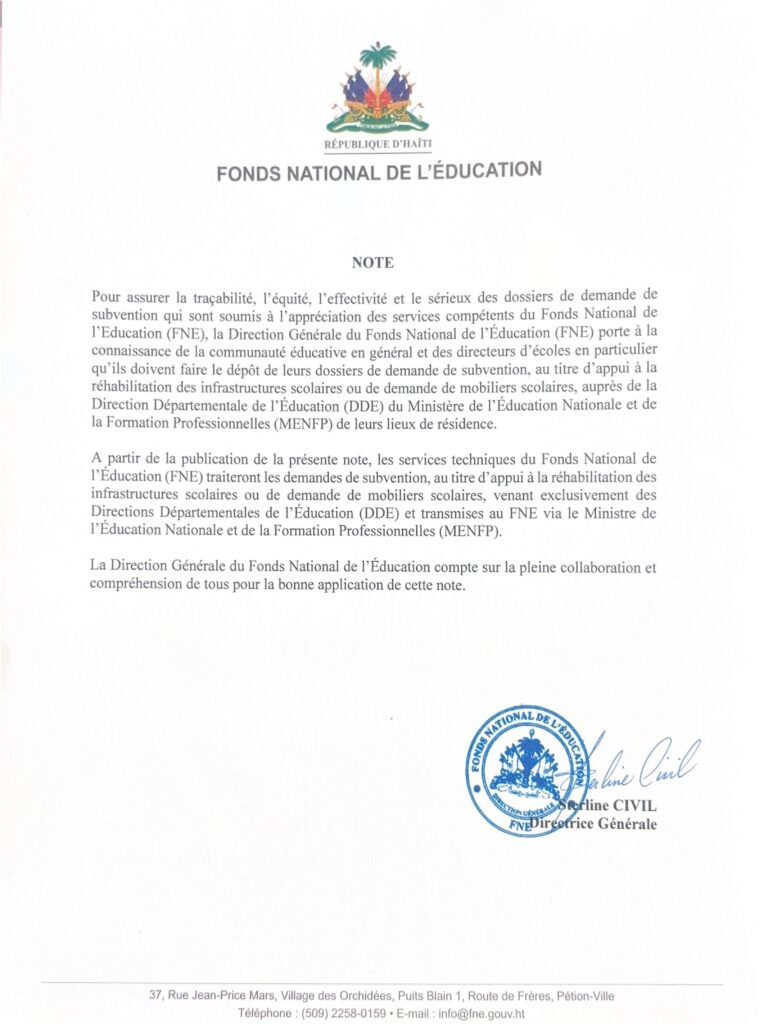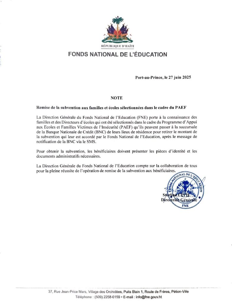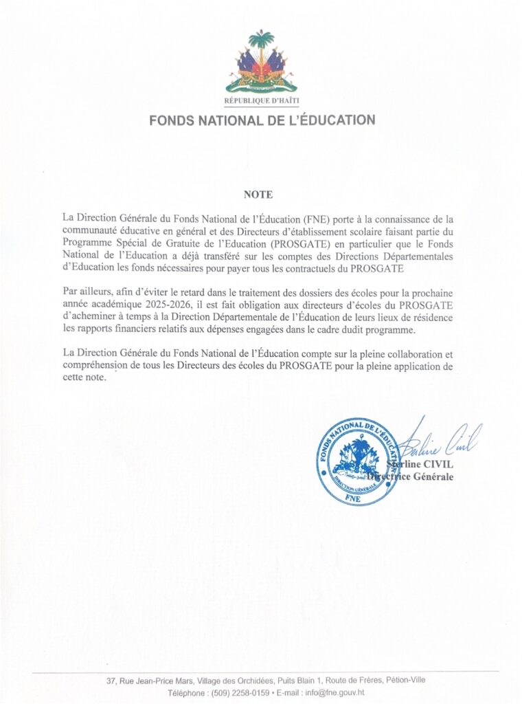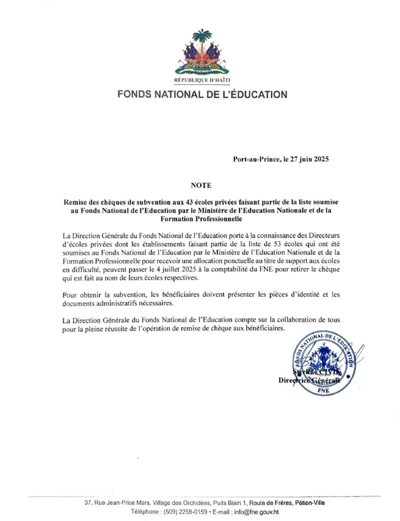 Le Fonds National de l’Éducation (FNE) informe le public qu’à l’occasion de la rentrée scolaire 2025-2026, une mission officielle a été déployée dans le Grand Nord, conformément aux instructions des autorités gouvernementales. Cette opération, conduite par la Directrice générale, Madame Sterline CIVIL, s’inscrit dans la continuité des interventions antérieures dans le Grand Sud et vise à renforcer l’appui de l’État aux établissements scolaires les plus vulnérables.